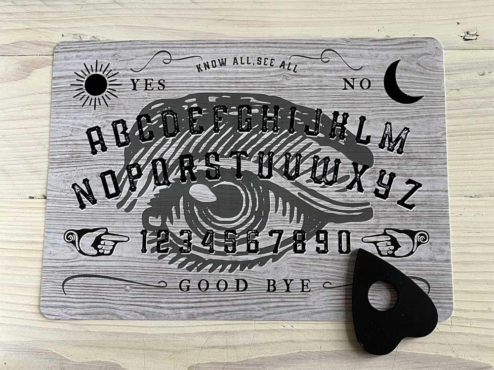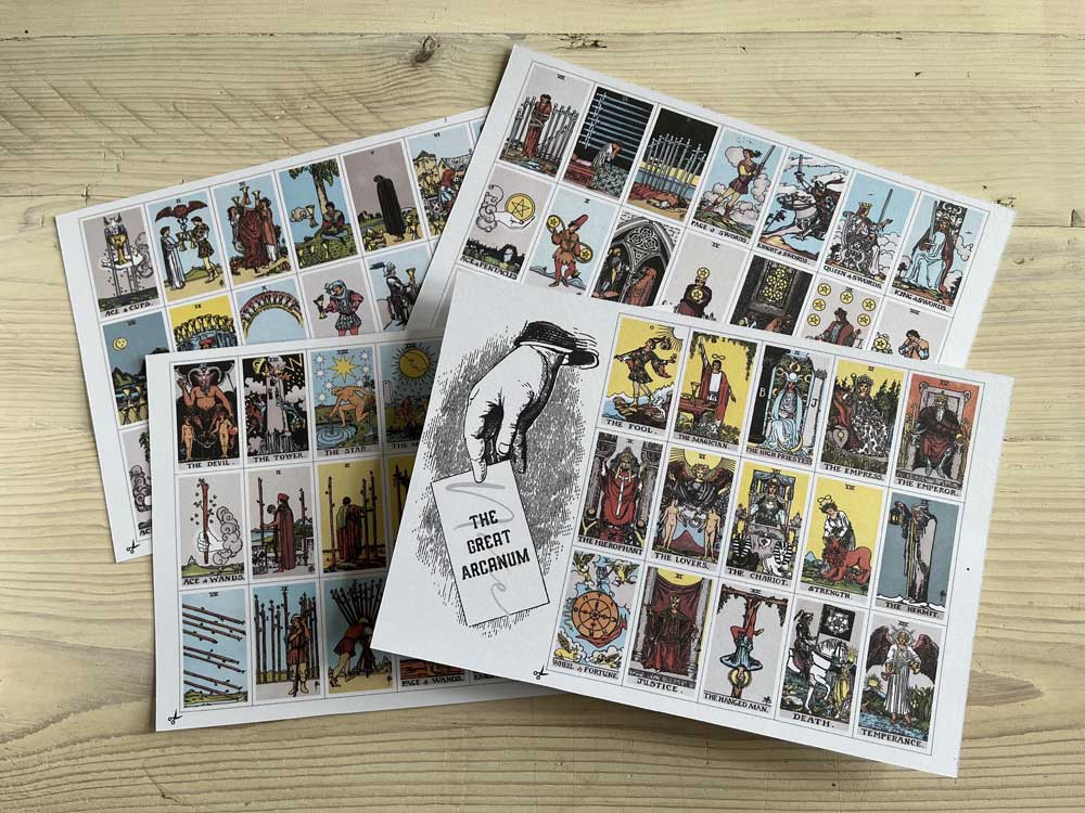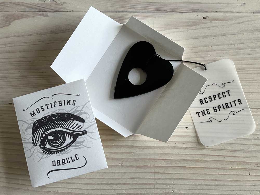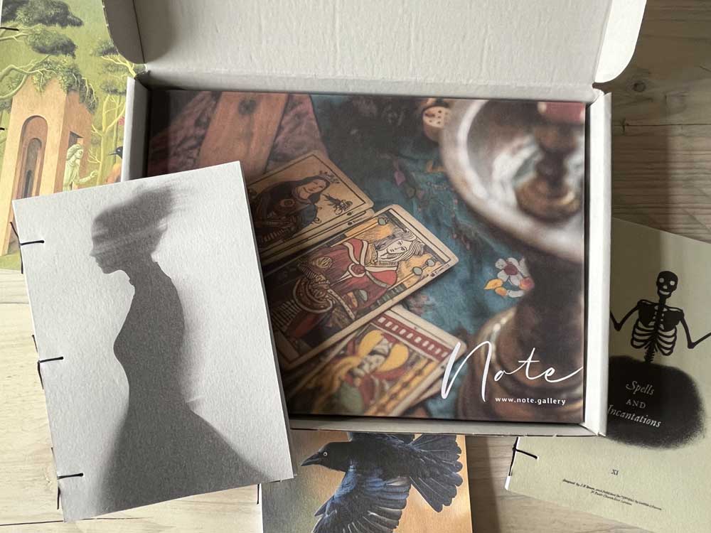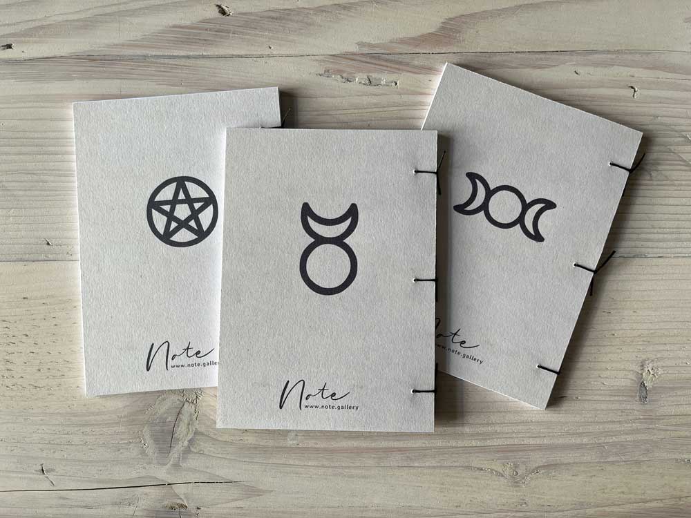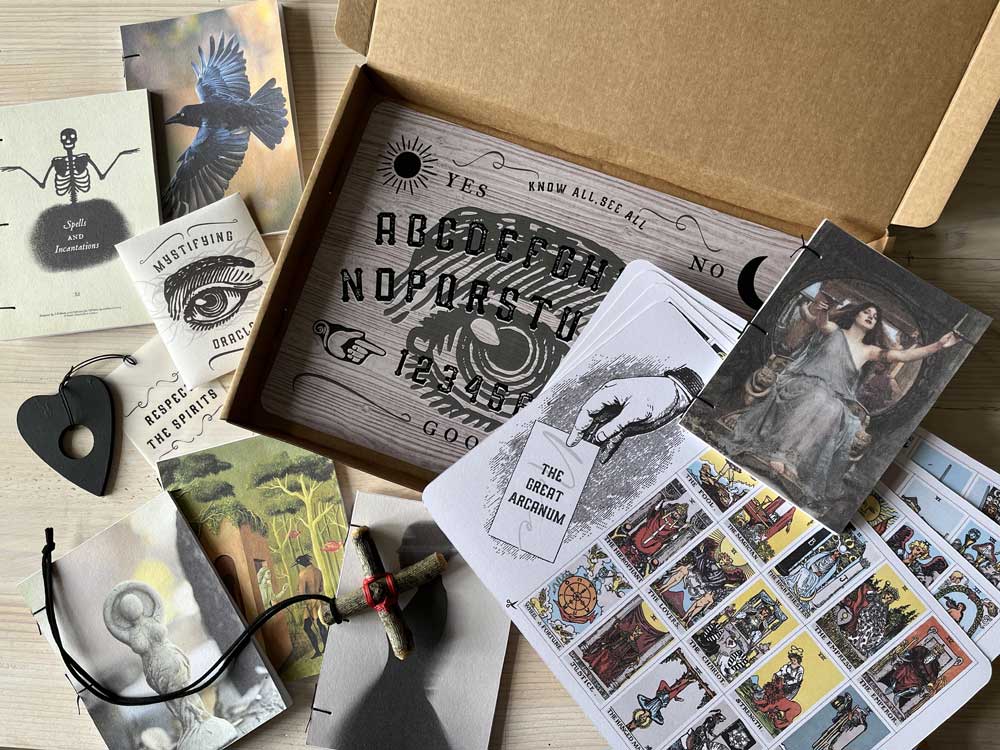 The gift set comprises all six Note books, a mini set of Tarot cards, a genuine rowan talisman (size varies due to natural materials) and talking board with planchette.