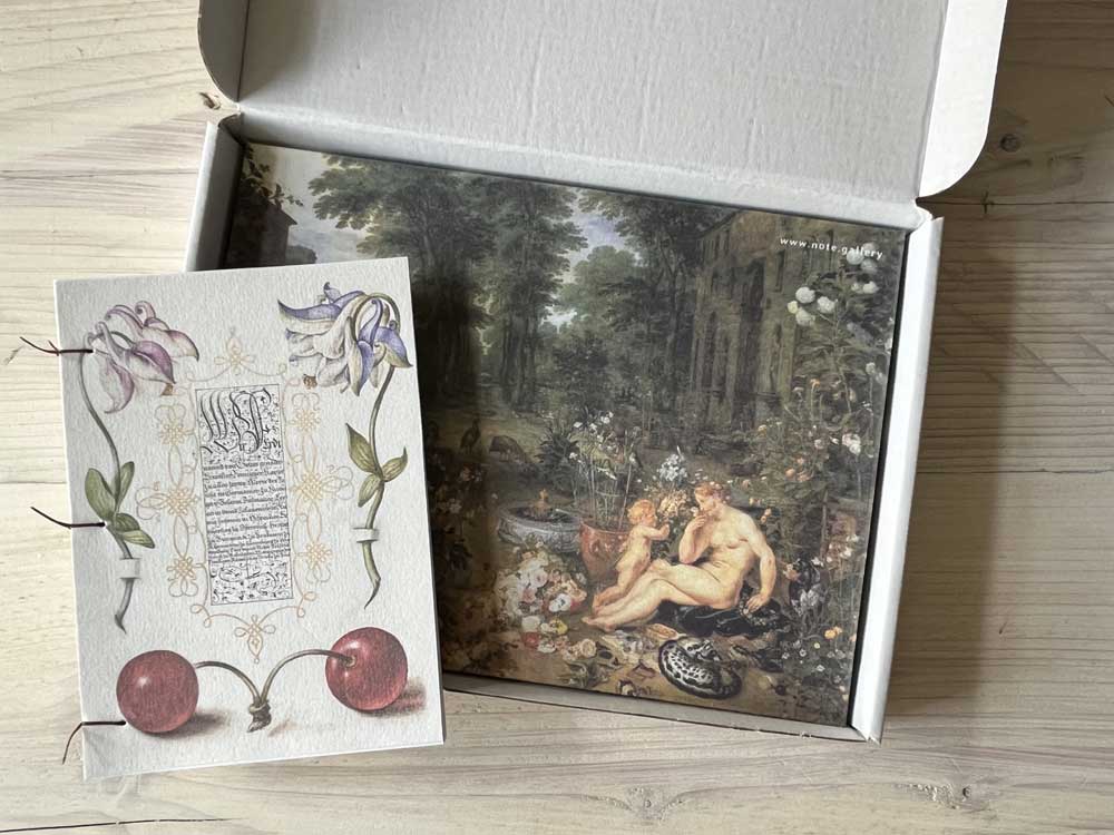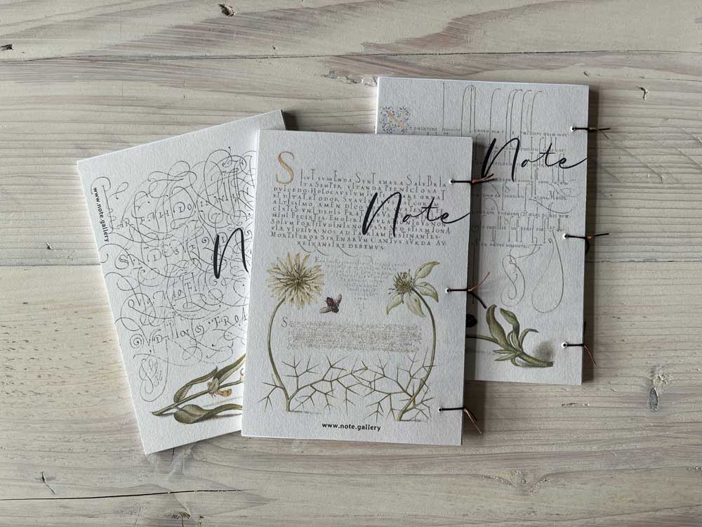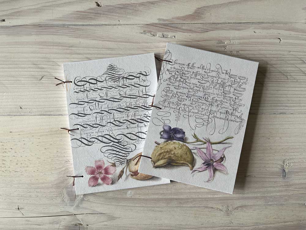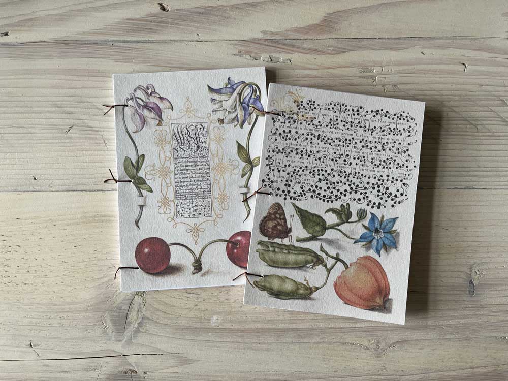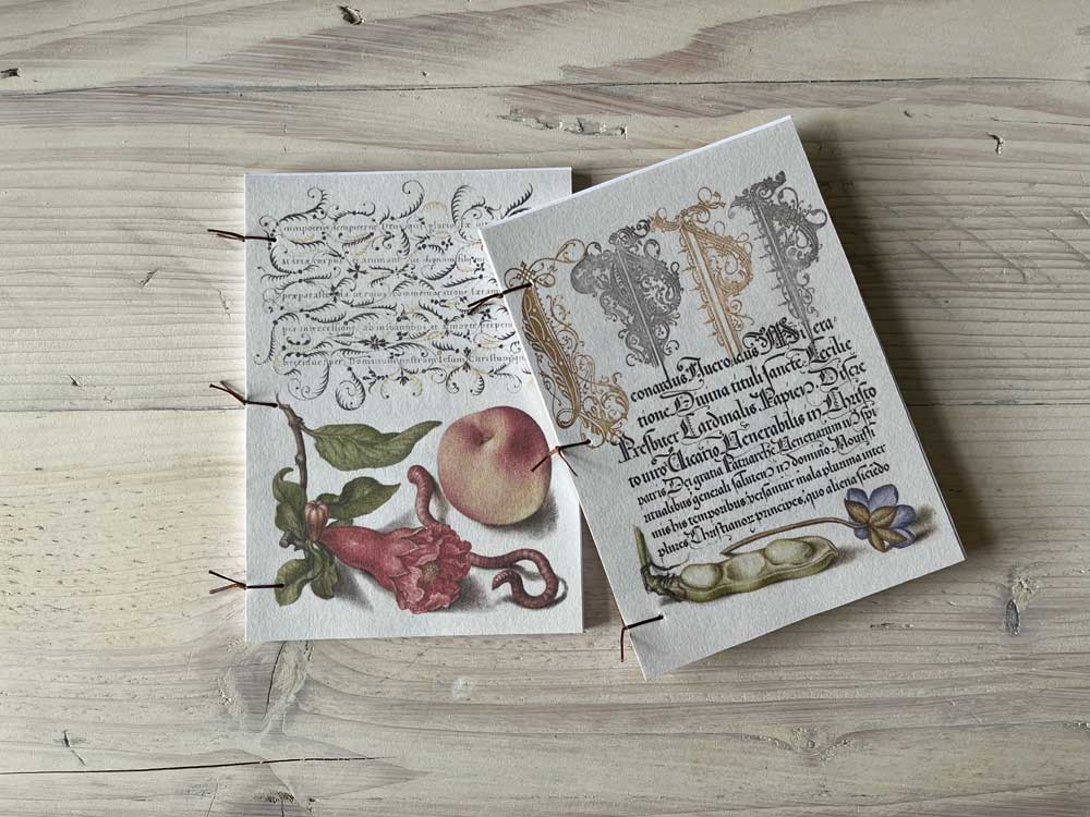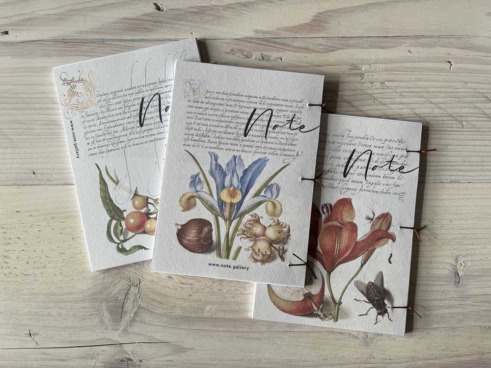The covers for this range are portfolio pages taken from the Model Book of Calligraphy, a Renaissance manuscript created by Georg Bocskay, a Croatian scribe, in 1561 and later illuminated by Joris Hoefnagel, a Flemish painter, at the beginning of the Baroque period in the 1590s. Originally commissioned for the Holy Roman Emperor Ferdinand I (who Bocskay was Court Secretary to) it was originally intended as a demonstration of masterful penmanship, showcasing a wide range of scripts and letterforms. Bocskay emphasised technical brilliance in writing, while Hoefnagel’s additions, commissioned by Ferdinand’s grandson Emperor Rudolph II, brought vivid decoration through naturalistic illustrations of plants, animals, and insects. The illustrations are totally unrelated to the text, but together the work perfectly merges technical artistry with visual ornamentation, resulting in a beautiful union of calligraphic learning and natural observation. The portfolio, like too many of the world’s great art treasures, is locked away in the J. Paul Getty Museum in Los Angeles, last exhibited in 2018. Our Note book selection is a modest personal attempt to make these wonderful designs better known.